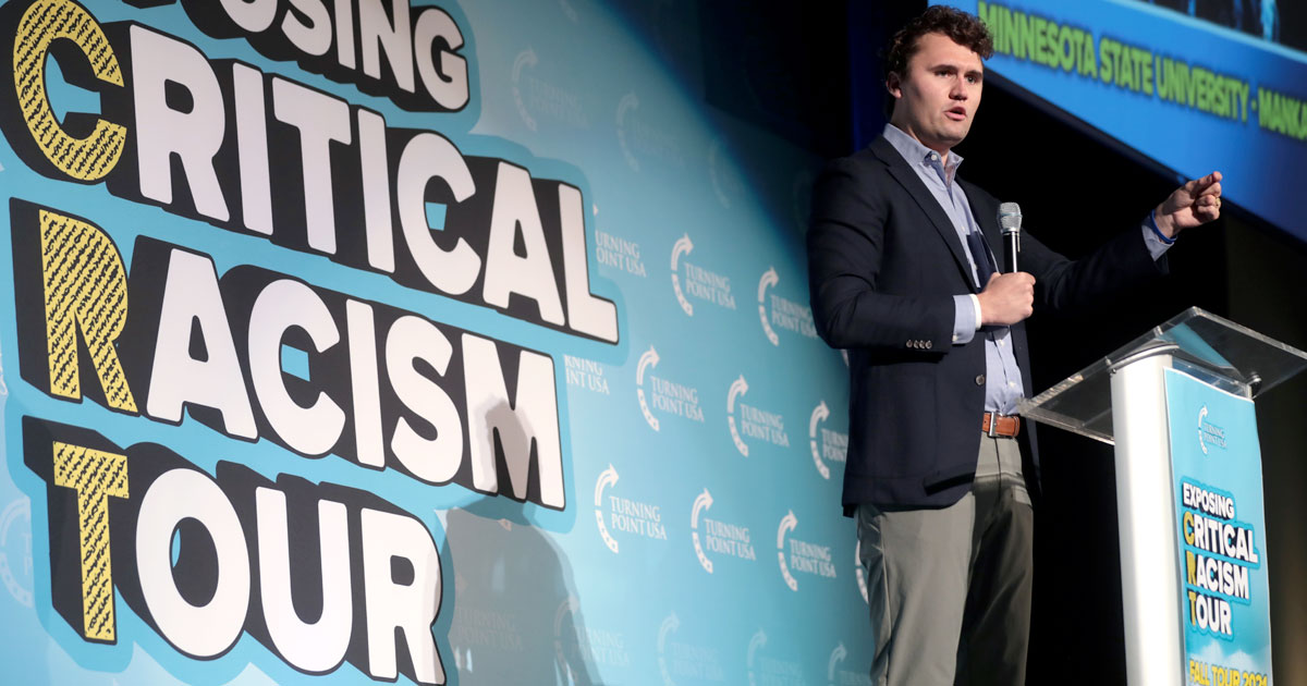 Charlie Kirk used bigotry to build and outrage his audience. He said on his show in 2023, “Happening all the time in urban America, prowling Blacks go around for fun to go target white people, that’s a fact. It’s happening more and more.”